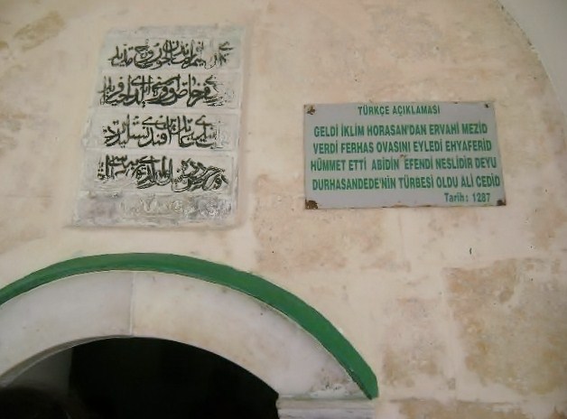 Kapısı üzerindeki Celi Sülüs hatla mermer üzerine dört satır olarak yazılmış kitabesinden H. 1287 / 1870-1871 yılında Yanyatıroğullarından Abidin Efendi tarafından tamir ettirildiğini öğreniyoruz. Durhasan Dede'nin bir adı da "Yanyatır"dır. Kapı sundurması altındaki eşikte görülen kazayağı simgesi, Yanyatır Tahtacılarının damgasıdır.